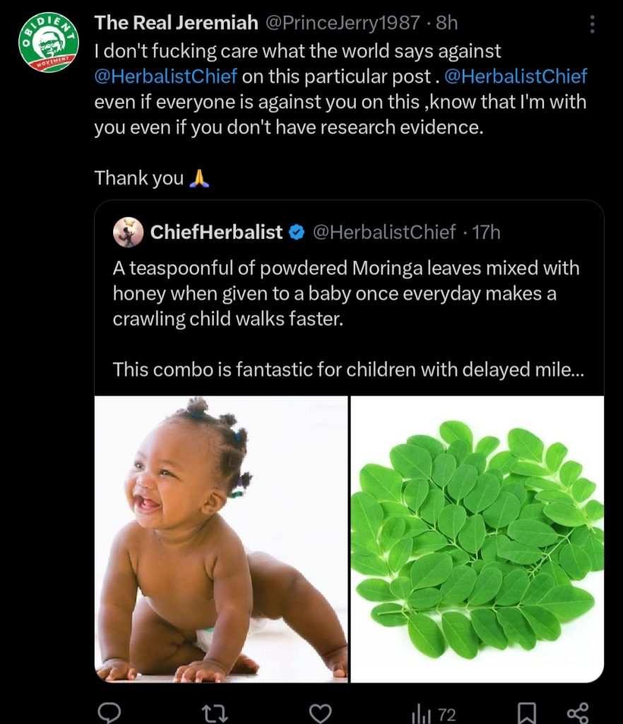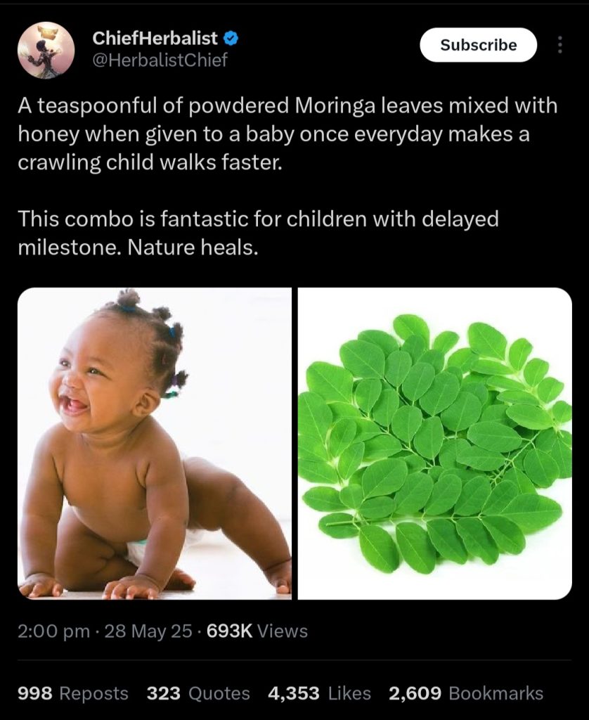 On Wednesday. 28th May 2025, he tweeted, “A teaspoonful of powdered moringa leaves mixed with honey when given to a baby once everyday makes a crawling child walk faster. The combo is fantastic for children with delayed milestone. Nature heals.” (sic)